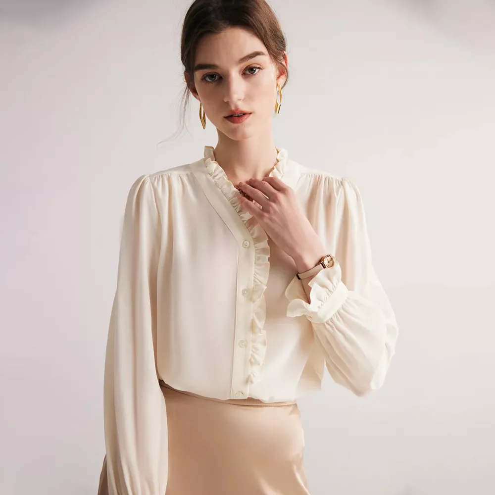 Discover Elegance with Our Silk V-Neck Ruffle Blouse