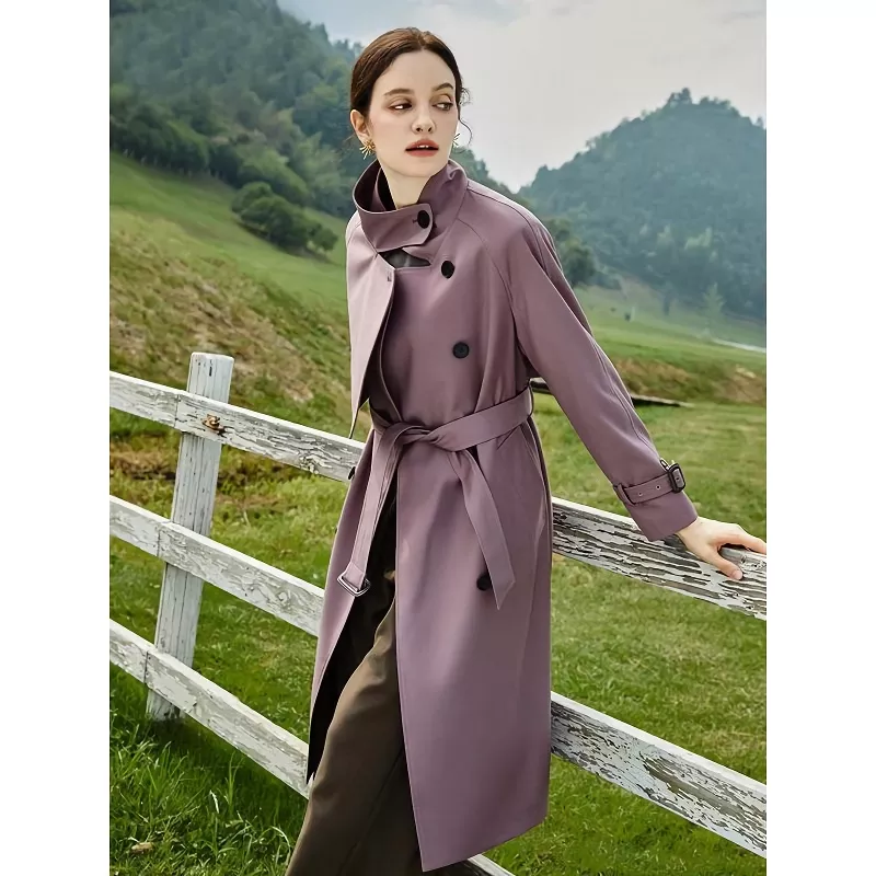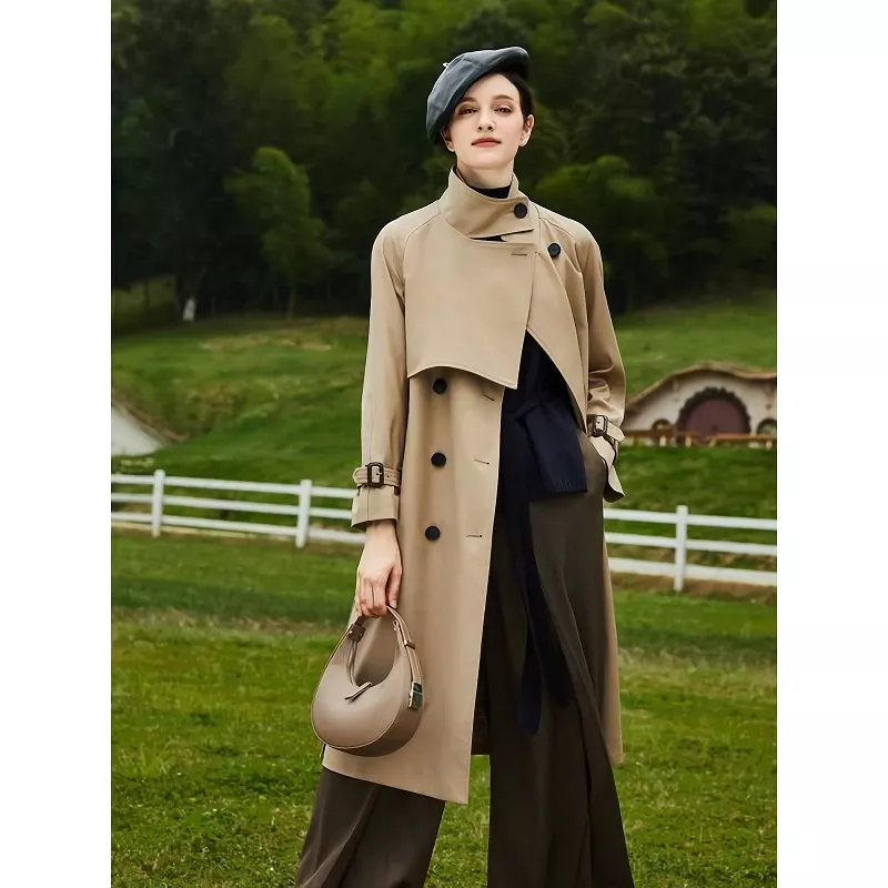 Our trench coat boasts a minimalist yet sophisticated British style, featuring a stand-up neck and a double-breasted closure that adds a touch of regality to your ensemble. Crafted from premium polyester, this coat ensures durability and comfort, making it ideal for all-season wear. The knee-length design offers ample coverage while maintaining a chic silhouette.