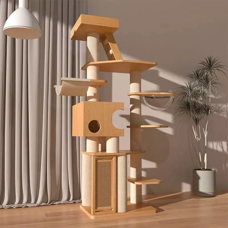 Our Luxury Solid Wood Cat Tree stands out with its integrated luxury cat frame and diving platform space, providing your pet with a unique vertical space for play and relaxation. The dual-tier structure offers endless fun and a safe haven for your cat, while the robust wood construction ensures stability and durability. Ideal for scratching, lounging, and playing, this cat tree is a must-have accessory for any pet owner who values their cat’s well-being and their home’s aesthetics.