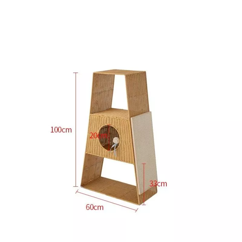This luxurious cat house is perfect for year-round use, offering a cozy retreat during winter and a breezy haven in the summer. Its multi-level design makes it ideal for households with more than one cat, providing ample space for individual or shared relaxation. Unlike ordinary cat beds, our Three-Story Rattan Woven Cat House with Scratch Board & Claw Grinder stands out with its unique design and multi-functional features. It’s a testament to our commitment to providing products that enhance the well-being of your pet while complementing your lifestyle and home aesthetics.
