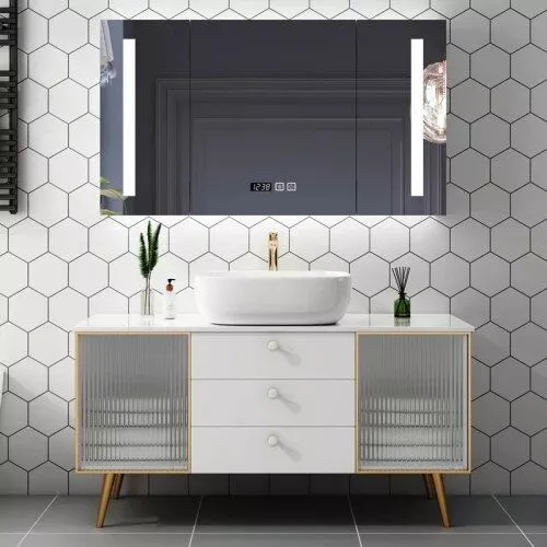 This vanity set is more than just a piece of furniture; it’s a statement of elegance. Equipped with a smart bathroom mirror, it brings a touch of modern technology to your daily routine. The mirror’s integrated light provides optimal illumination, making your grooming rituals effortless and enjoyable. The marble countertop washbasin adds a touch of sophistication, while the oak carcase offers robust support and a natural charm.